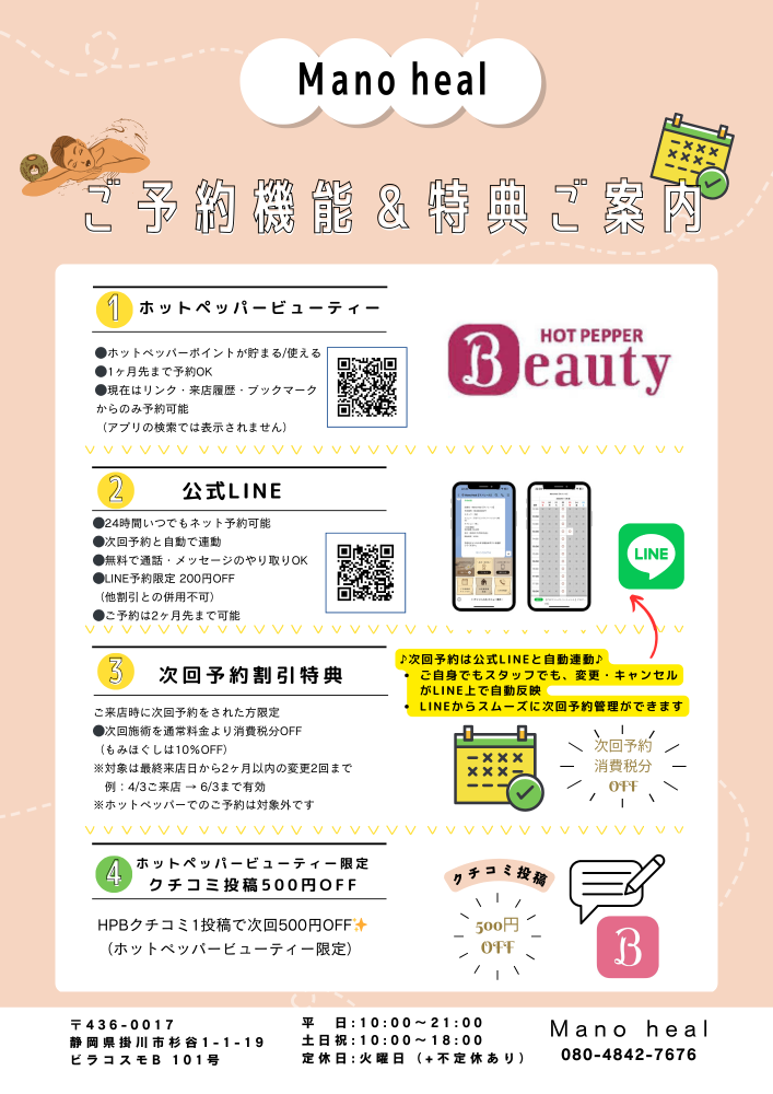 | ・女性限定サロン ・完全予約制 ・都度払いOK ・ドリンクサービスあり ・お子様連れは事前にご相談ください ・お客様のマスク着用は自由/施術中はスタッフが着用 ・次回使える割引特典あり |